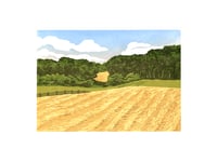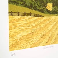 A view from the window of the artist's studio in Monkton, just after the wheat field was harvested. Beautiful gold textures emerge from the remaining stalks, contrasting with the green grass and trees behind.