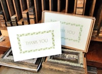 Thank you cards featuring new border designs created and cast (in typemetal!) by Val Lucas. These cards show off the new Folium Undulatum border and the Amanita mushroom border, along with antique typefaces chosen to complement the borders. Printed on recycled paper with kraft envelopes, these cards measure 3.5x5 and are blank inside for your message. Set of 6 cards, one design per set.